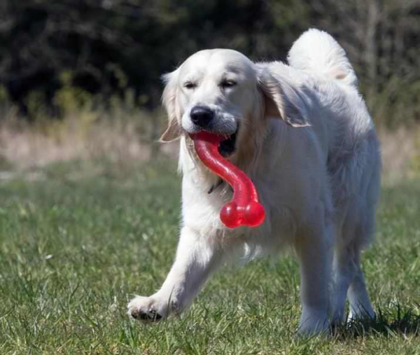 핑크빛 장난감을 입에 물고 있는 강아지 입니다.
