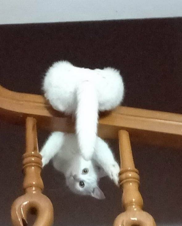 다소 특이한 자세로 난간에 매달려 있는 고양이의 모습입니다.