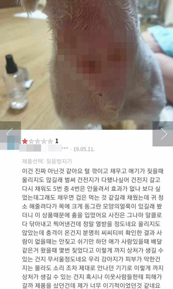 짖음방지기로 인해 반려견이 상처를 입었다는 리뷰글입니다.