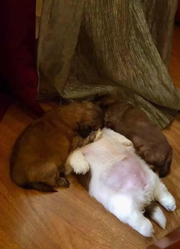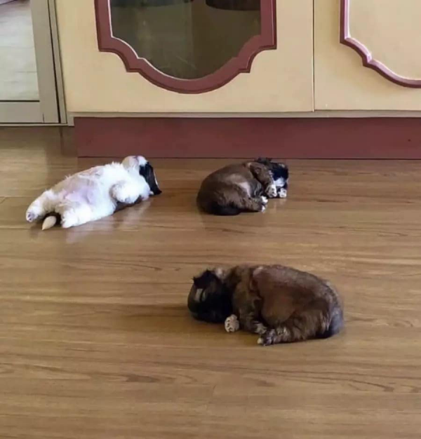 여전히 그 자세를 유지하며 강아지들 사이에 파묻혀서 자는 모습입니다.