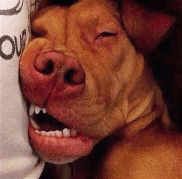 얼굴의 옆쪽이 뭉개진 채로 자는 강아지입니다.