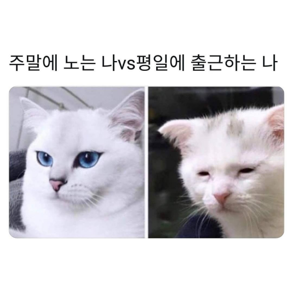 고양이의 모습에서 우리가 주말에 쌩쌩한 모습과 피곤에 찌들 대로 찌든 평일에 모습이 비치네요.