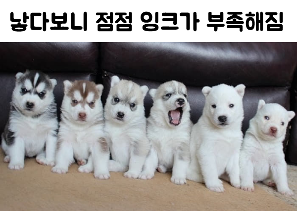 강아지 프린터가 출력을 거듭하자 잉크가 점차 부족해지는 모습입니다.