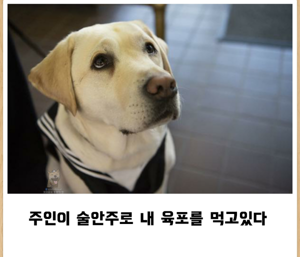 주인이 술에 취해 자신의 육포를 먹는 모습을 목격한다면 이것보다 더 착잡한 표정이 될 수도 있을 것 같네요.