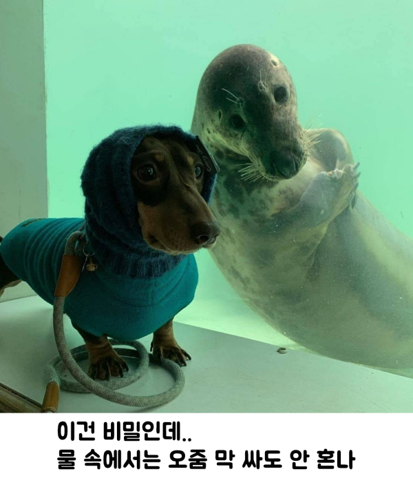 물에 사는 댕댕이이라는 물개가 강아지에게 비밀 하나를 속삭이는 듯한 모습인데요.