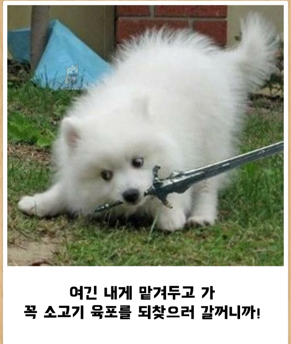 마치 판타지 만화 속의 캐릭터처럼 멋진 대사를 남기는 강아지의 모습입니다.