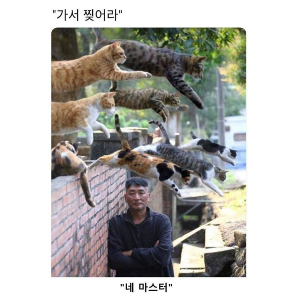 한 쪽에선 일제히 고양이들이 담을 넘고있으며 어떤 한 사람이 팔짱을 끼고 담벼락에 기대어 있습니다.