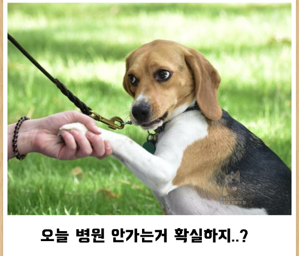 산책을 나가자는 주인을 갑자기 병원으로 데려가지는 않을까하며 의심하는 강아지의 모습입니다.
