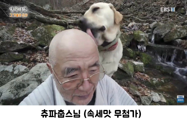 땀을 흘리는 스님을 열심히 핥아주는 강아지의 모습인데요.