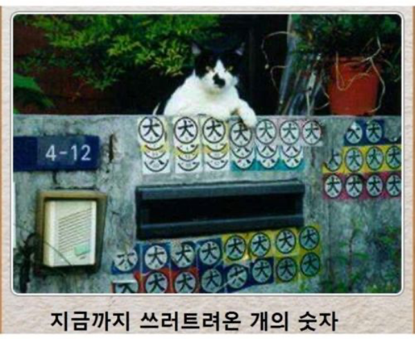 고양이가 기대어 있는 벽에 한자로 개 견자가 적힌 스티커들이 쭉 붙어있습니다.