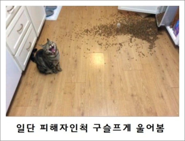 사료를 쏟아버리는 사고를 쳐놓고 크게 울고 있는 고양이입니다.