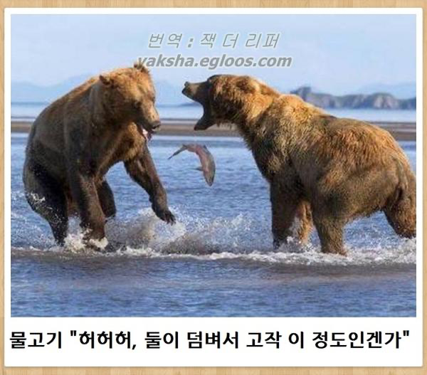 물고기의 모습이 마치 곰들을 유린하듯 요리조리 피하고 있는 것 같습니다.