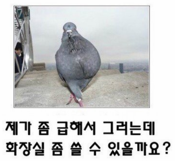 비둘기의 다리가 X로 교차되어 있는 모습이 밀려나오는 변을 틀어막고 있는 것처럼 보여서 큰 웃음을 줍니다.