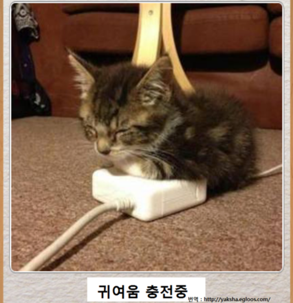 충전기 위가 따뜻한지 잔뜩 웅크린 아기 고양이의 모습입니다.