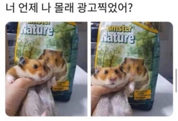 햄스터 먹이의 포장지에 찍혀있는 햄스터와 똑닮은 귀여운 햄스터가 집사의 손에 잡혀있습니다.
