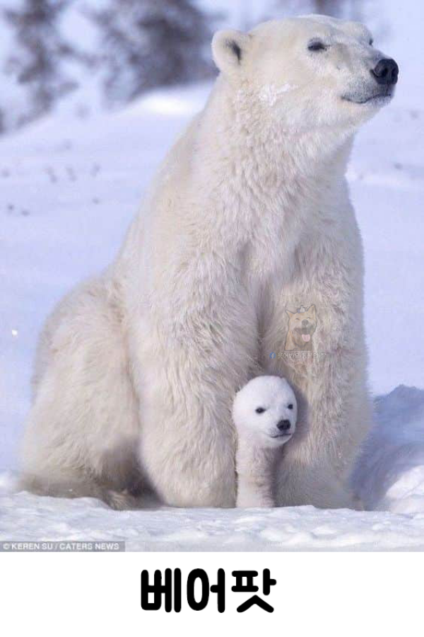 엄마의 품 속에서 빼꼼 삐져나온 아기 북극곰의 모습입니다.