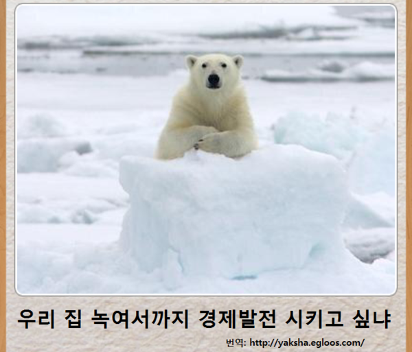 다소 웃기게 표현되었지만, 실제로 지구 온난화로 인해 북극곰들이 살아갈 터전을 잃어가고 있습니다.