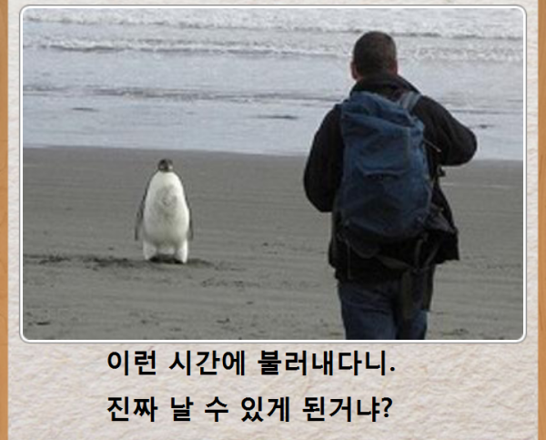 비장한 모습으로 자신이 비행하는 장면을 보려주려는 펭귄입니다.