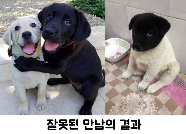 흰 강아지와 검은 강아지가 만나서 오른쪽에 보이는 독특한 털색을 가진 아기 강아지를 낳았습니다.