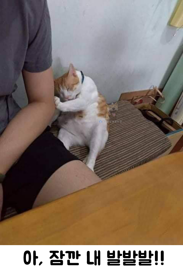 집사가 자리에 앉다가 고양이의 발을 미처 발견 못하고 그 위로 앉아버린 것 같습니다.
