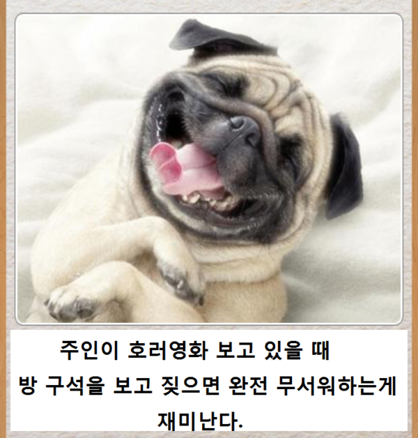 짓궂은 표정으로 웃고 있는 강아지 사진입니다.