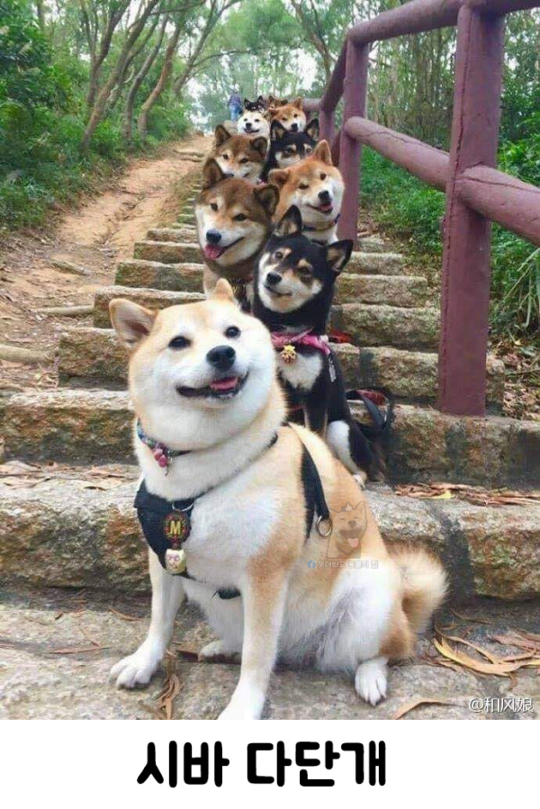 다양한 종류의 시바견들이 계단에 쭈르륵 서있는 모습인데요.