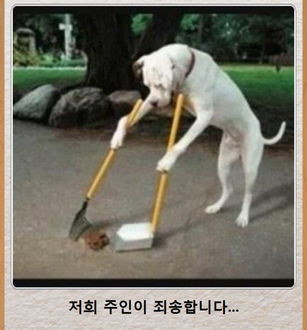 도구를 쓰면서 거리를 청소하고 있는 대단한 강아지의 모습입니다.