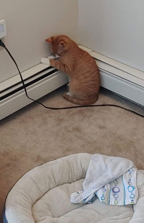 벽면 주위의 히터에 기대어 잠자는 고양이입니다.
