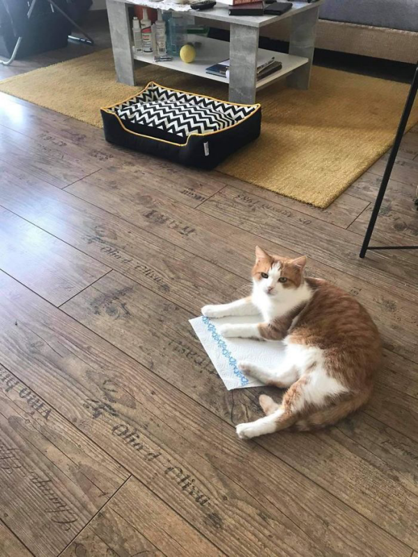 푹신한 침대대신 바닥에 깔려있는 휴지를 택한 고양이입니다.