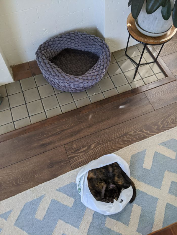 저 앞에 좋은 침대를 내버려 두고 왜 비닐봉투를 선택했는지 도통 알 수가 없습니다.