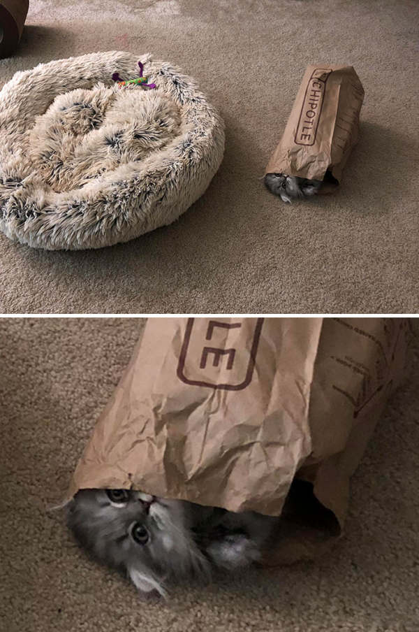 쿠션보다 좁고 부스럭거리는 감촉을 더 좋아하는 고양이입니다.