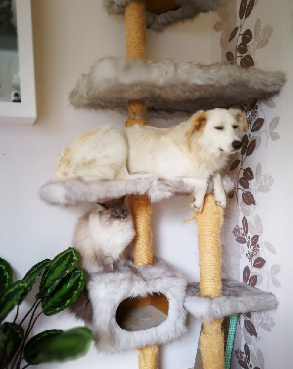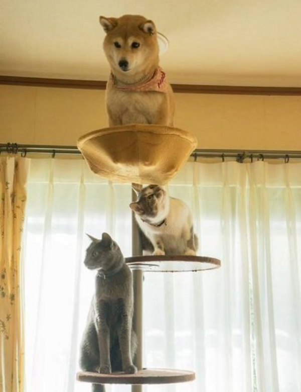 이 사진 또한 캣타워의 한 부분을 차지한 강아지의 모습입니다.