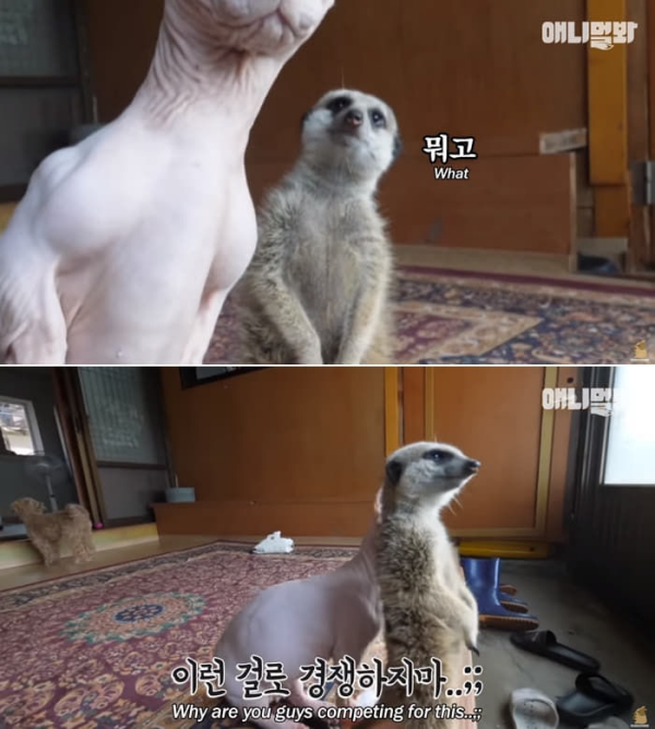 자신을 따라하는 고양이를 보고 미어캣도 당황한 모습이네요.