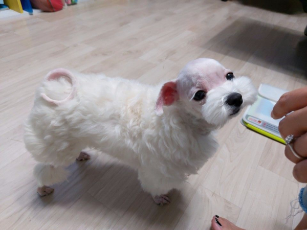 하얀 털을 밀어버리자 분홍 속살이 드러나버린 켄터키 컷입니다.